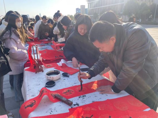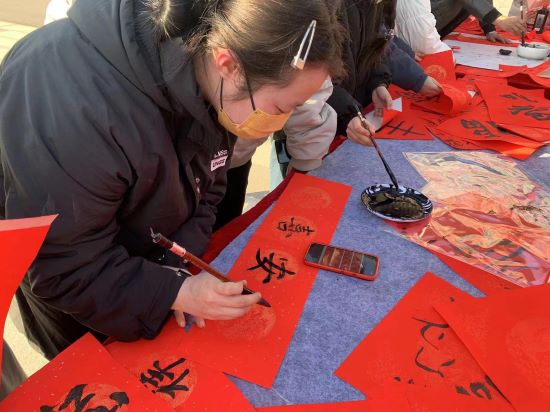 廣大師生熱情參加,一邊欣賞墨寶一邊排隊領(lǐng)春聯(lián),更有同學(xué)自己動(dòng)手書(shū)寫(xiě)、積極互動(dòng)。一箋墨香承載著(zhù)民族的文化自信,副副春聯(lián)帶著(zhù)滿(mǎn)滿(mǎn)的祝福溢出校園,飄入千家萬(wàn)戶(hù)。